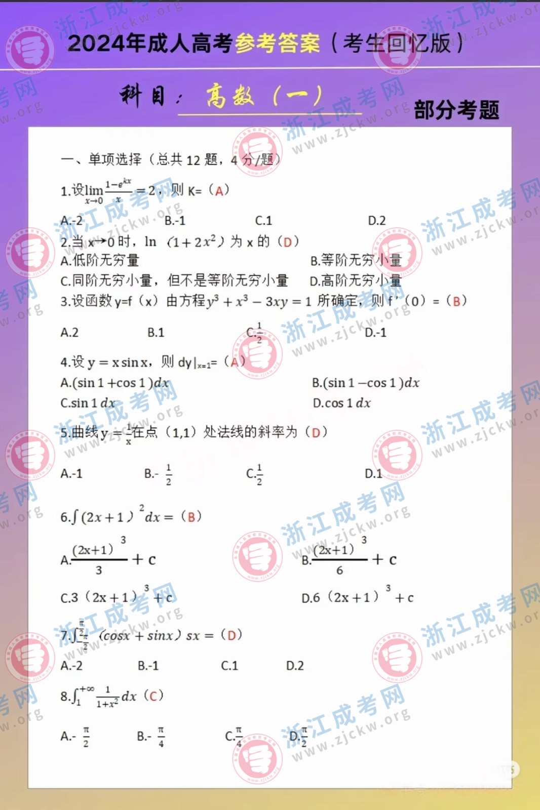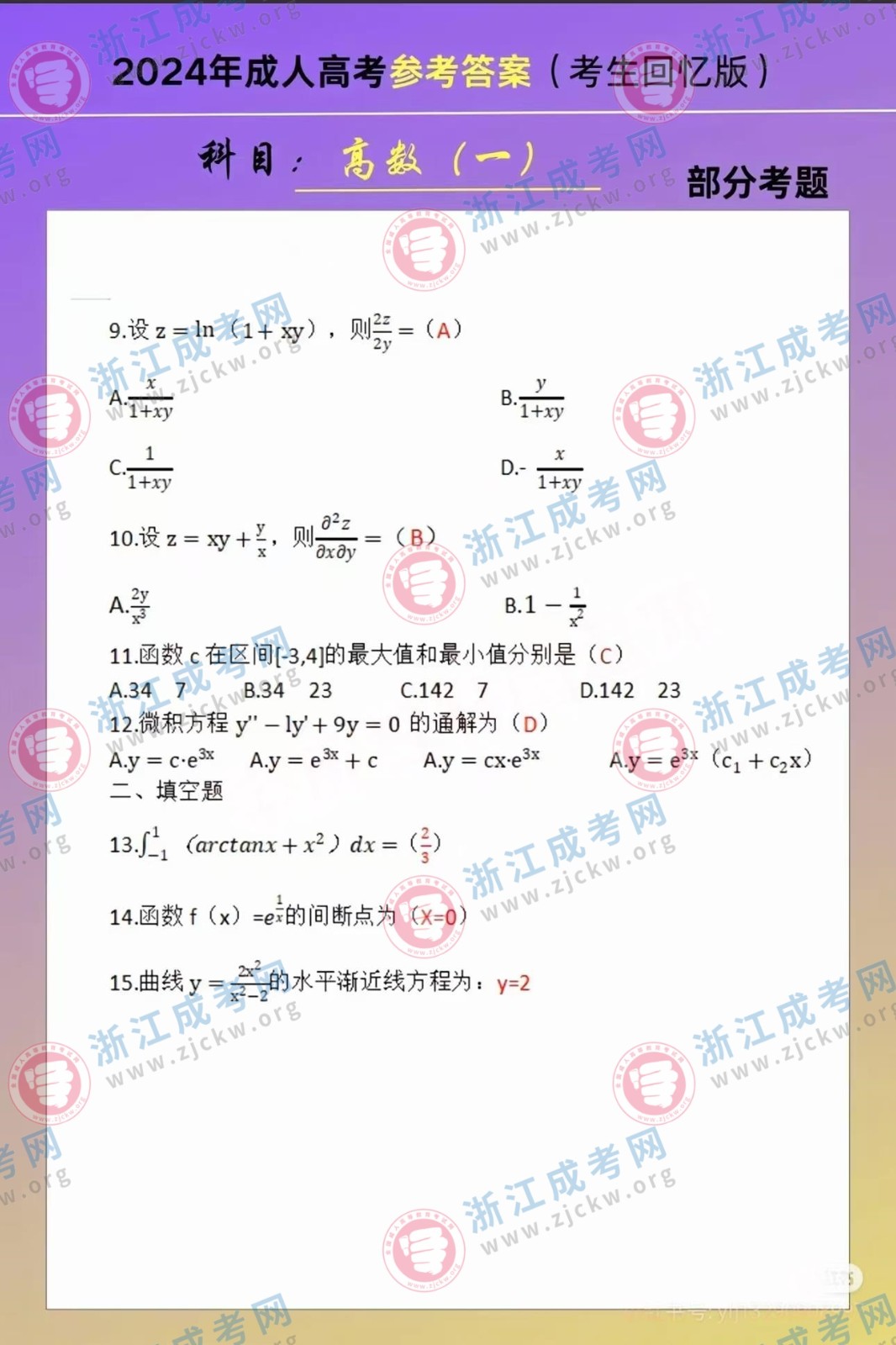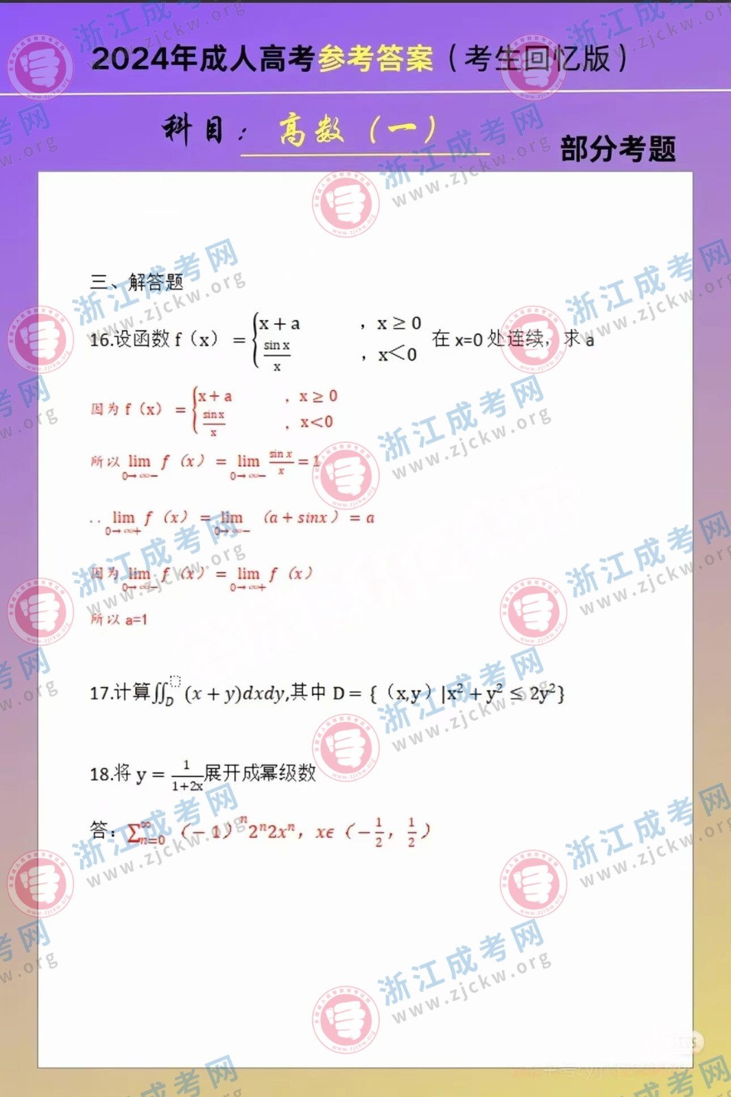 杭州成考網(wǎng)為廣大考生提供2024年成人高考全國統(tǒng)一考試(專升本生數(shù)一)真題答案